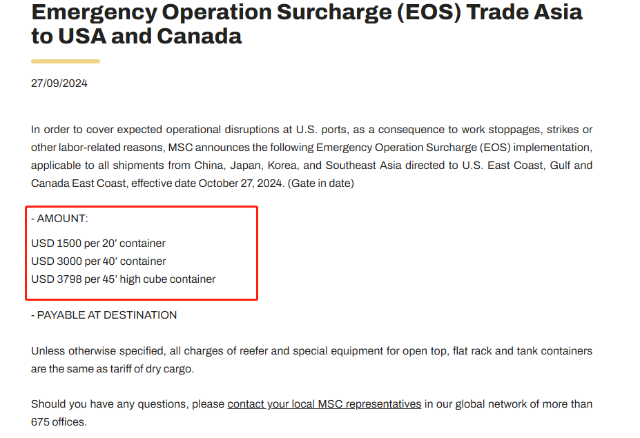 此外,MSC还宣布实施以下紧急操作附加费(EOS),适用于从中国、日本、韩国和东南亚发往美国东海岸、墨西哥湾和加拿大东海岸的所有货物,生效日期为2024年10月27日(进港日期)。