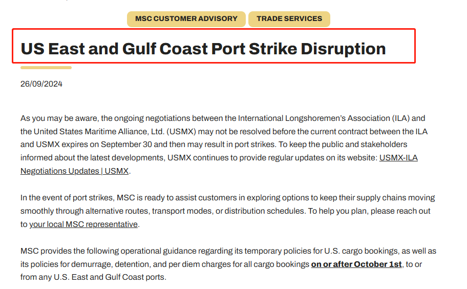 由于美国东部和墨西哥湾沿岸港口的罢工威胁越来越近,船公司纷纷展开了一系列计划以应对运输中断。全球第一大航运公司地中海航运(MSC)调整了相关航线的订舱政策。
